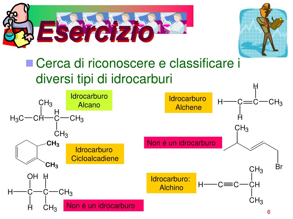Esercizio • Cerca di riconoscere e classificare i diversi tipi di idrocarburi Idrocarburo Alcano Idrocarburo Alchene Non è un idrocarburo Idrocarburo Cicloalcadiene Idrocarburo: Alchino Non è un idrocarburo