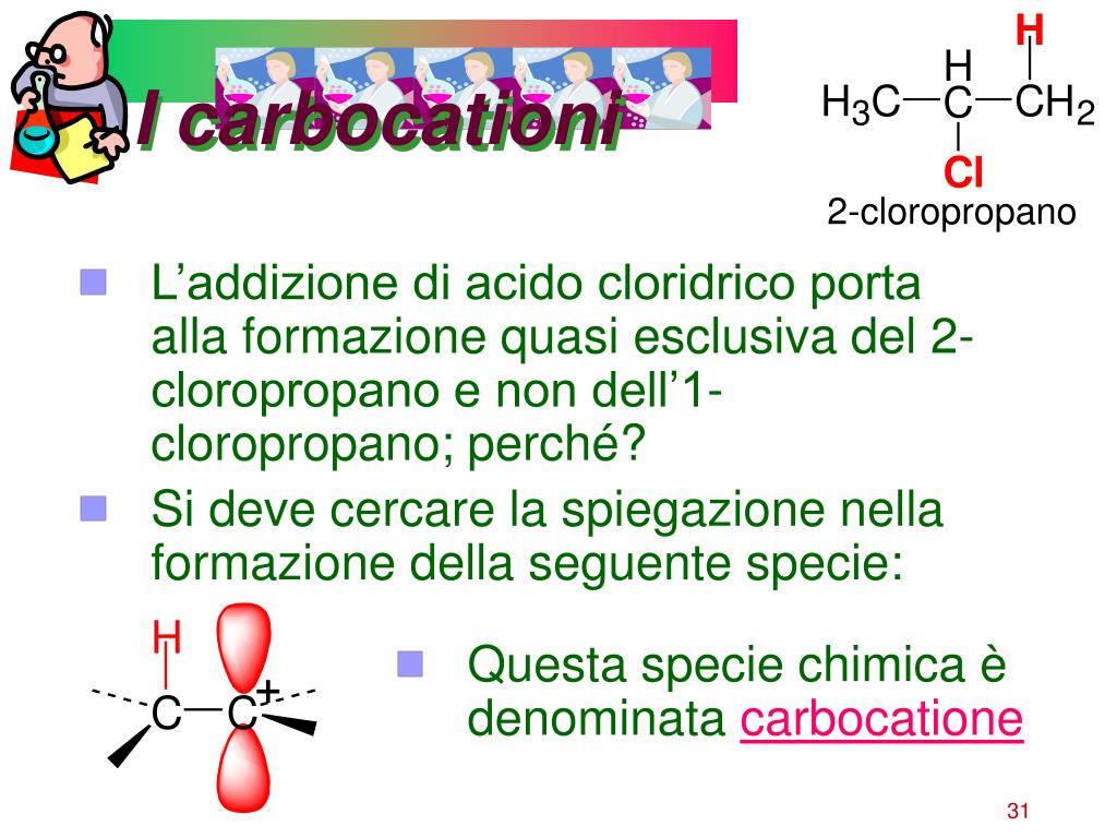 I carbocationi 2-cloropropano • L’addizione di acido cloridrico porta alla formazione quasi esclusiva del 2-cloropropano e non dell’1-cloropropano; perché? • Si deve cercare la spiegazione nella formazione della seguente specie: • Questa specie chimica è denominata carbocatione