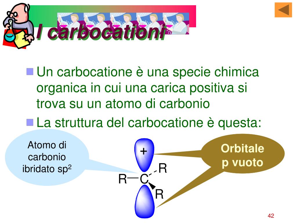 Orbitale p vuoto Orbitale p vuoto I carbocationi • Un carbocatione è una specie chimica organica in cui una carica positiva si trova su un atomo di carbonio • La struttura del carbocatione è questa: Atomo di carbonio ibridato sp2