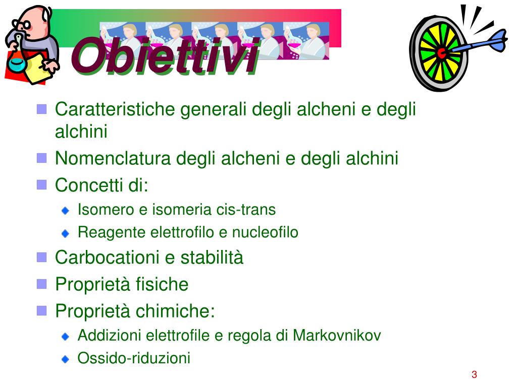 Obiettivi • Caratteristiche generali degli alcheni e degli alchini • Nomenclatura degli alcheni e degli alchini • Concetti di: • Isomero e isomeria cis-trans • Reagente elettrofilo e nucleofilo • Carbocationi e stabilità • Proprietà fisiche • Proprietà chimiche: • Addizioni elettrofile e regola di Markovnikov • Ossido-riduzioni