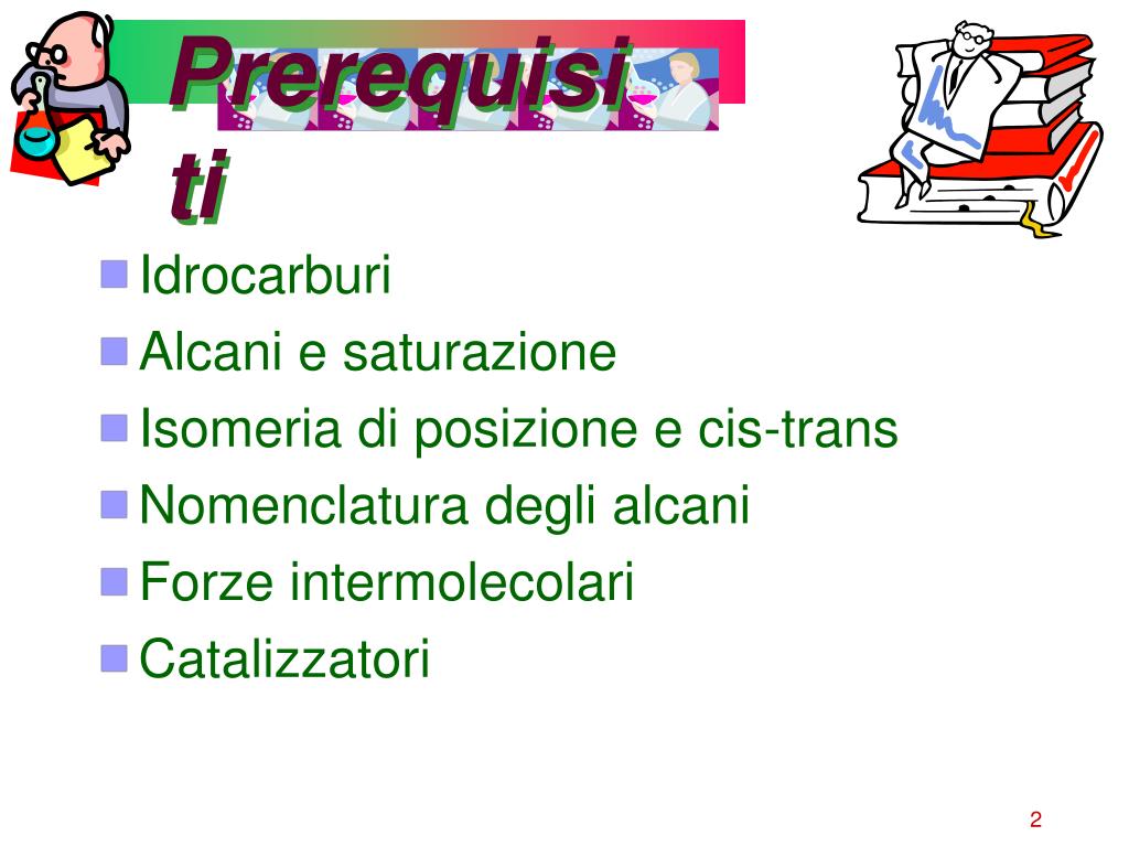 Prerequisiti • Idrocarburi • Alcani e saturazione • Isomeria di posizione e cis-trans • Nomenclatura degli alcani • Forze intermolecolari • Catalizzatori