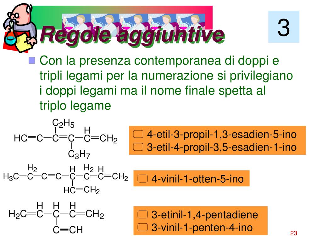 2 Regole aggiuntive • Se ci sono più doppi o tripli legami ci si comporta come con i sostituenti multipli (2,3-dimetil oppure 5,5,3-trietil) 2,4-esandiene 1,3-esandiino 2-metil-1,3-butandiene • La catena da scegliere deve essere sempre quella più lunga ma che contiene il maggior numero di legami multipli, privilegiando quelli doppi per la numerazione • 4,5-divinil-4-ottene • 3,4-dipropil-1,3,5-esantriene