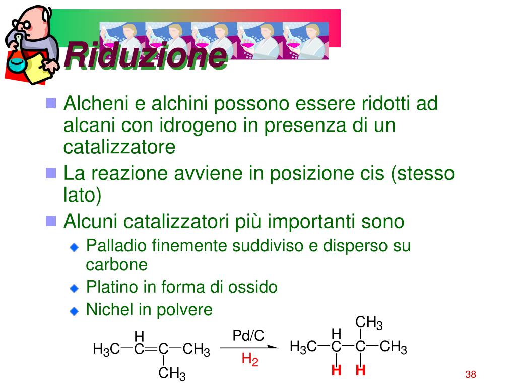 Riduzione • Alcheni e alchini possono essere ridotti ad alcani con idrogeno in presenza di un catalizzatore • La reazione avviene in posizione cis (stesso lato) • Alcuni catalizzatori più importanti sono • Palladio finemente suddiviso e disperso su carbone • Platino in forma di ossido • Nichel in polvere