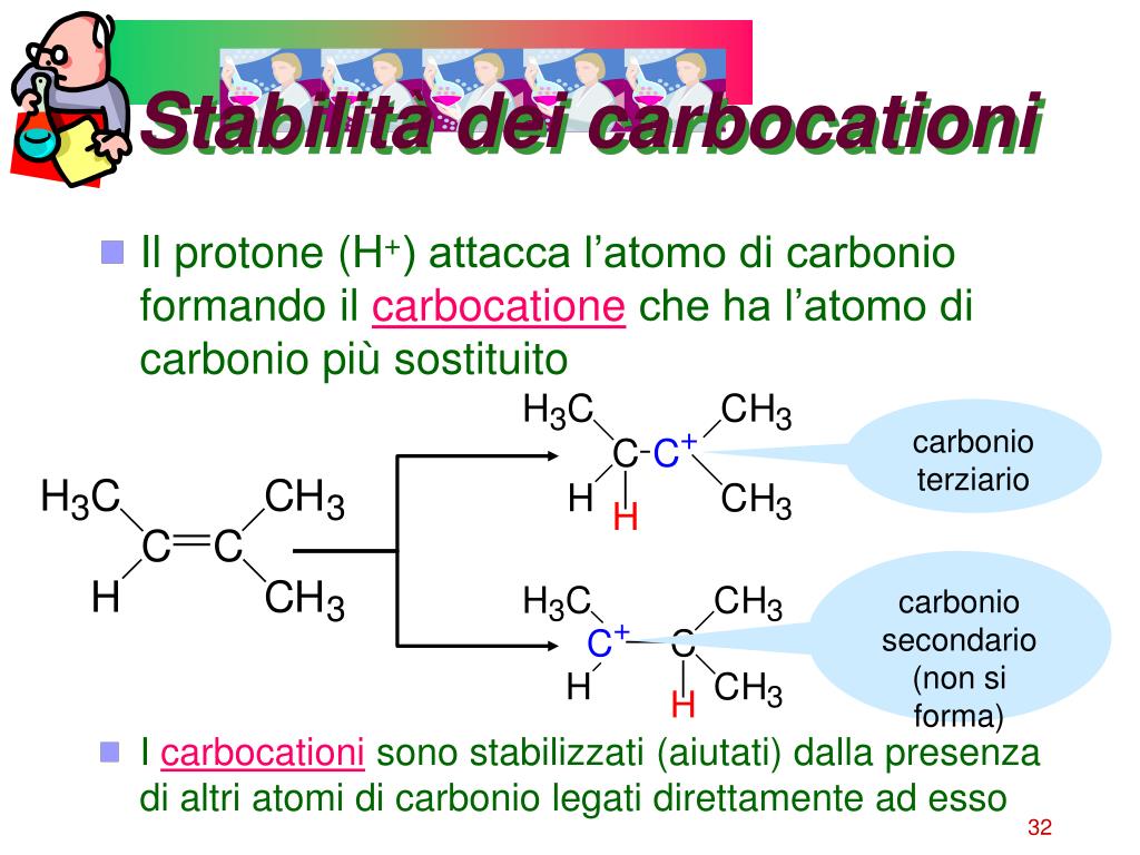 Stabilità dei carbocationi • Il protone (H+) attacca l’atomo di carbonio formando il carbocatione che ha l’atomo di carbonio più sostituito carbonio terziario carbonio secondario (non si forma) • I carbocationi sono stabilizzati (aiutati) dalla presenza di altri atomi di carbonio legati direttamente ad esso