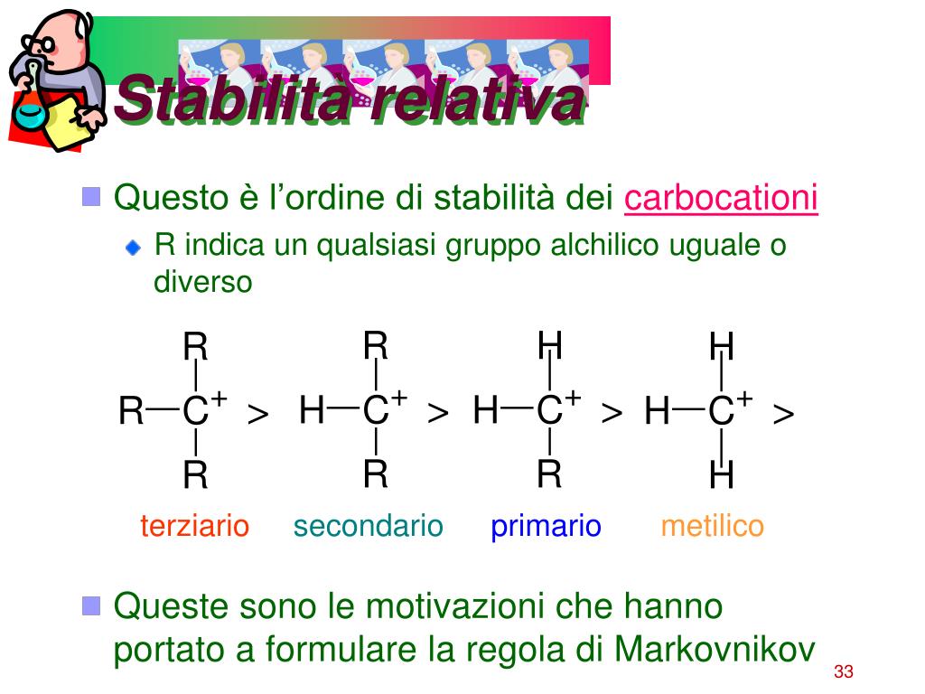 Stabilità relativa • Questo è l’ordine di stabilità dei carbocationi • R indica un qualsiasi gruppo alchilico uguale o diverso terziario secondario primario metilico • Queste sono le motivazioni che hanno portato a formulare la regola di Markovnikov