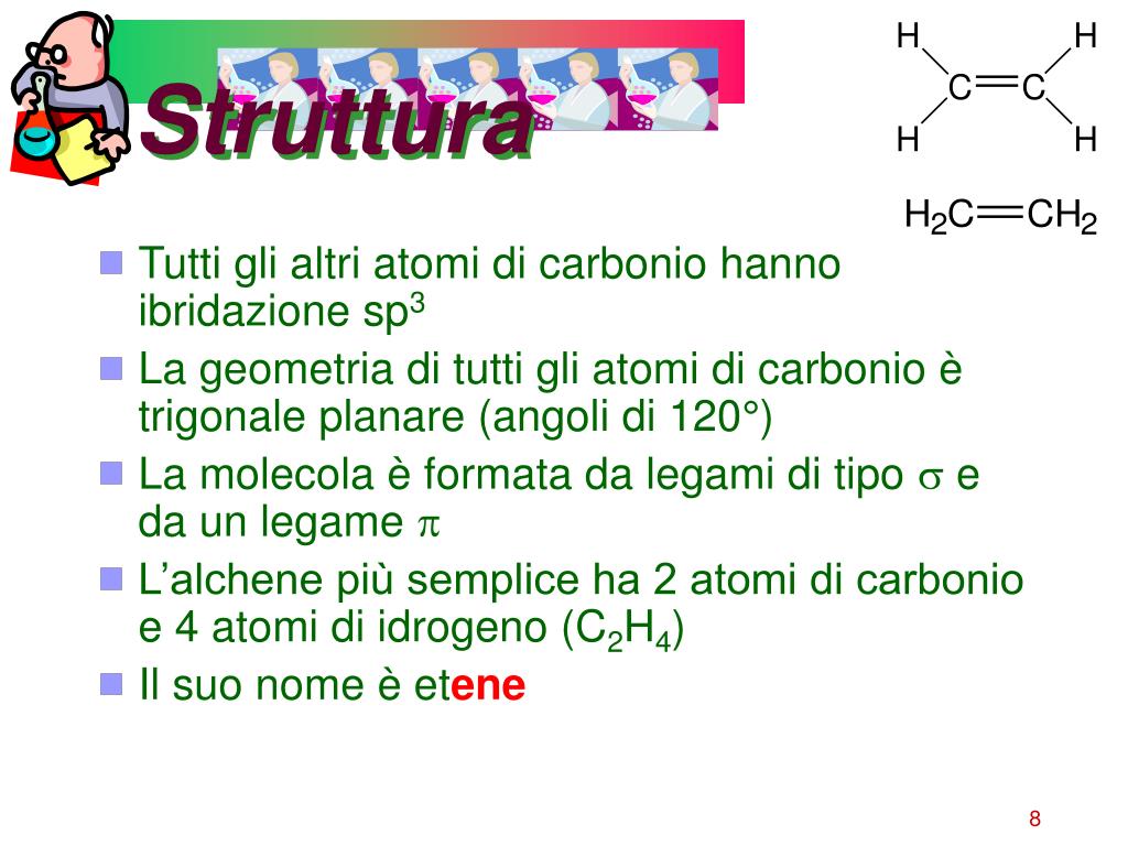 Struttura • Tutti gli altri atomi di carbonio hanno ibridazione sp3 • La geometria di tutti gli atomi di carbonio è trigonale planare (angoli di 120°) • La molecola è formata da legami di tipo e da un legame • L’alchene più semplice ha 2 atomi di carbonio e 4 atomi di idrogeno (C2H4) • Il suo nome è etene