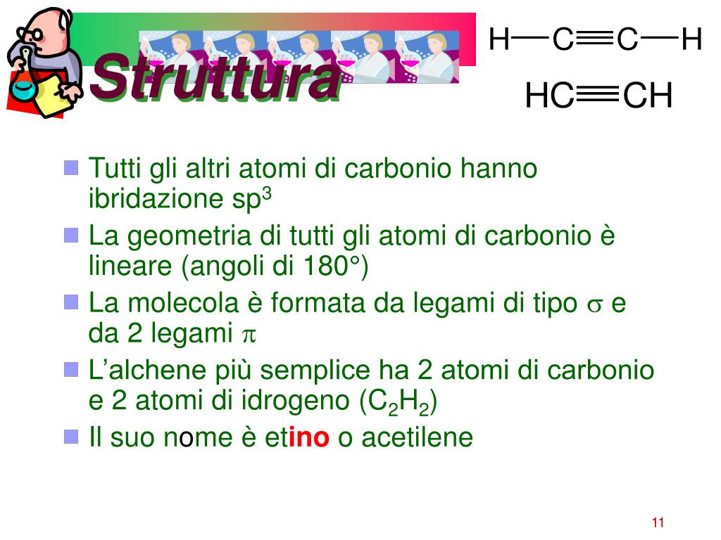 Struttura • Tutti gli altri atomi di carbonio hanno ibridazione sp3 • La geometria di tutti gli atomi di carbonio è lineare (angoli di 180°) • La molecola è formata da legami di tipo e da 2 legami • L’alchene più semplice ha 2 atomi di carbonio e 2 atomi di idrogeno (C2H2) • Il suo nome è etino o acetilene
