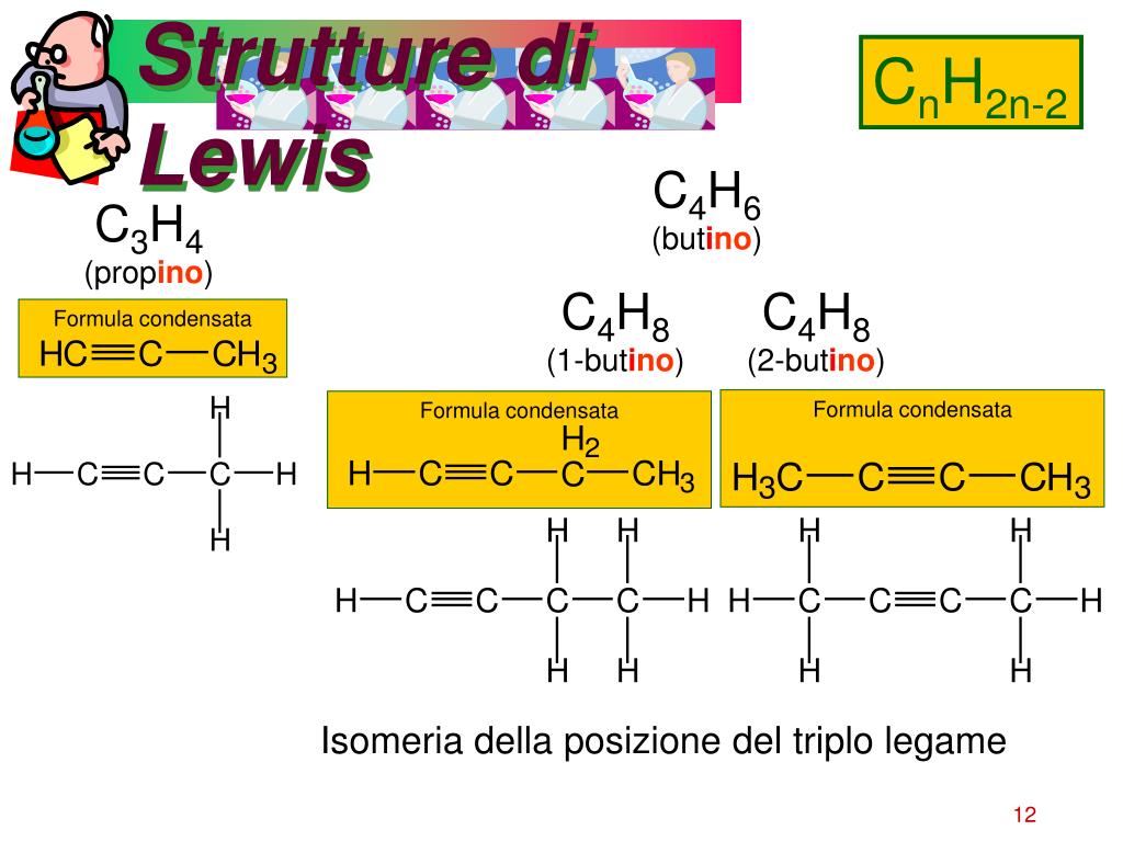 Formula condensata Formula condensata Formula condensata CnH2n-2 Strutture di Lewis C4H6 (butino) C3H4 (propino) C4H8 (1-butino) C4H8 (2-butino) Isomeria della posizione del triplo legame