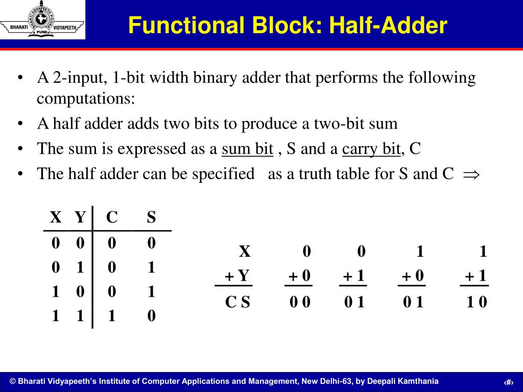 X 0 0 1 1 + Y + 0 + 1 + 0 + 1 C S 0 0 0 1 0 1 1 0 X Y C S 0 0 0 0 0 1 0 1 1 0 0 1 1 1 1 0 Functional Block: Half-Adder • A 2-input, 1-bit width binary adder that performs the following computations: • A half adder adds two bits to produce a two-bit sum • The sum is expressed as a sum bit , S and a carry bit, C • The half adder can be specified as a truth table for S and C