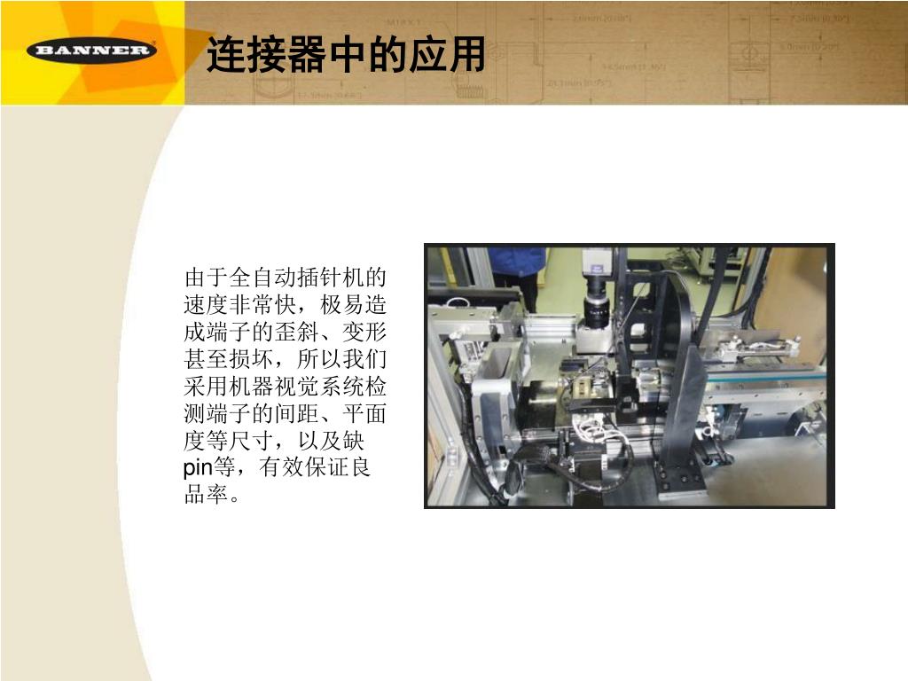 连接器中的应用 由于全自动插针机的速度非常快,极易造成端子的歪斜、变形甚至损坏,所以我们采用机器视觉系统检测端子的间距、平面度等尺寸,以及缺pin等,有效保证良品率。