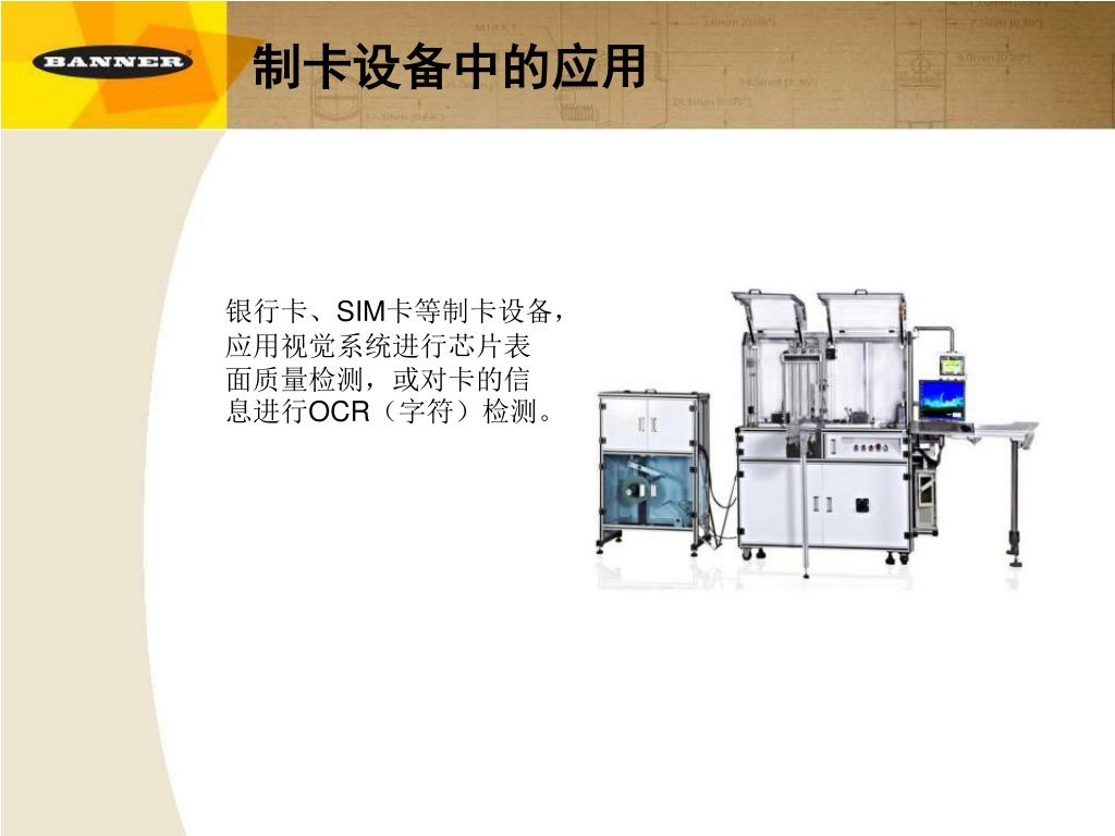 制卡设备中的应用 银行卡、SIM卡等制卡设备,应用视觉系统进行芯片表面质量检测,或对卡的信息进行OCR(字符)检测。