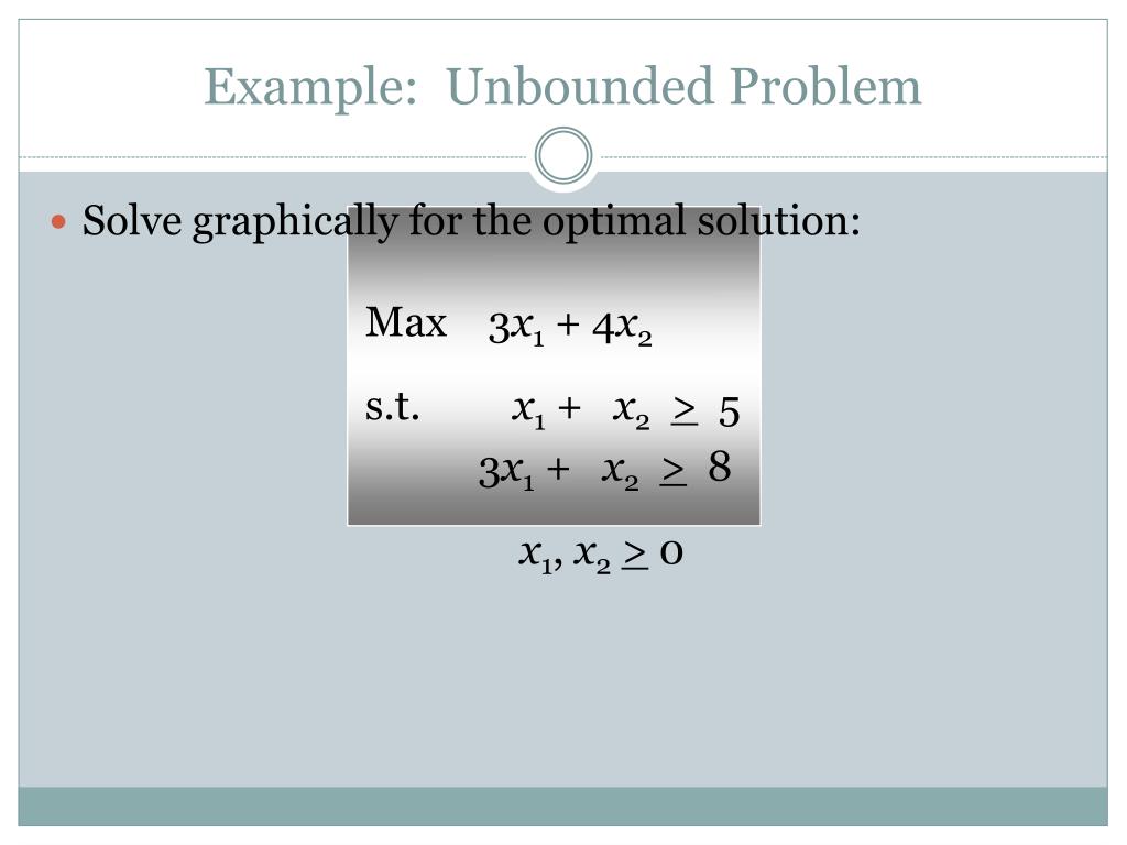 Example: Unbounded Problem Solve graphically for the optimal solution: Max 3x1 + 4x2 s.t. x1 + x2> 5 3x1 + x2> 8 x1, x2> 0