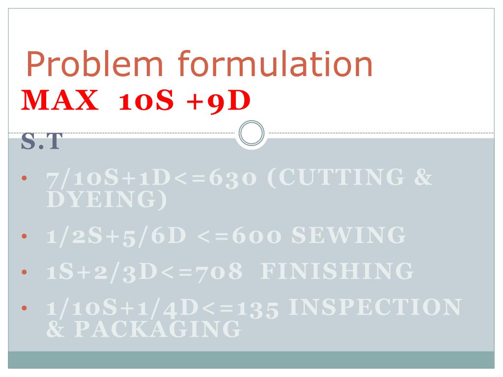 Problem formulation Max 10S +9D s.t 7/10S+1D<=630 (Cutting & dyeing) 1/2S+5/6D <=600 Sewing 1S+2/3D<=708 Finishing 1/10S+1/4D<=135 Inspection & Packaging
