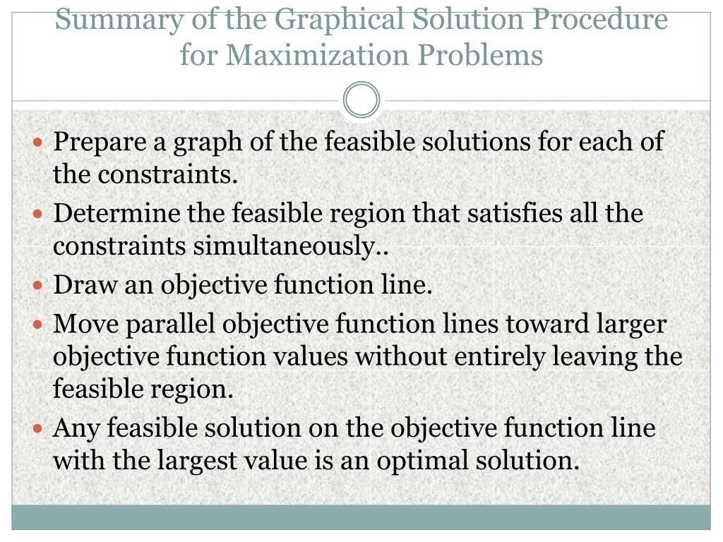 Summary of the Graphical Solution Procedurefor Maximization Problems Prepare a graph of the feasible solutions for each of the constraints. Determine the feasible region that satisfies all the constraints simultaneously.. Draw an objective function line. Move parallel objective function lines toward larger objective function values without entirely leaving the feasible region. Any feasible solution on the objective function line with the largest value is an optimal solution.