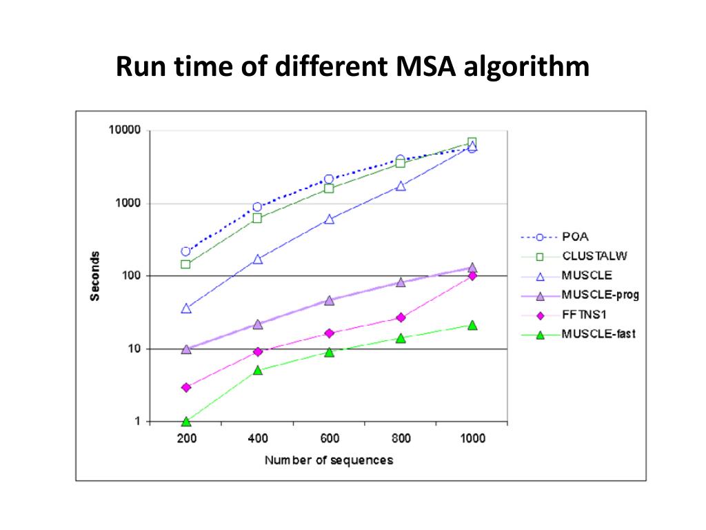 Summary of MUSCLE • Three stage algorithm • Stage 1: Draft progressive • k-mer distance • UPGMA tree (TREE1) • Guide tree based alignment (MSA1) • Stage 2: Improved progressive • Distance derived from MSA1 • UPGMA tree (TREE2) • Redo alignment for nodes with changed orderings • Repeat until number of re-ordered nodes does not change • Stage 3: Iterative refinement • Generate subtree profiles • Realign profiles • Keep realignment if of higher score • Repeat until no more improvement or fixed number of steps. • MUSCLE-fast: Stage 1 • MUSCLE-p: Stage1 and 2 Note different convergence criteria in Stages 2 and 3