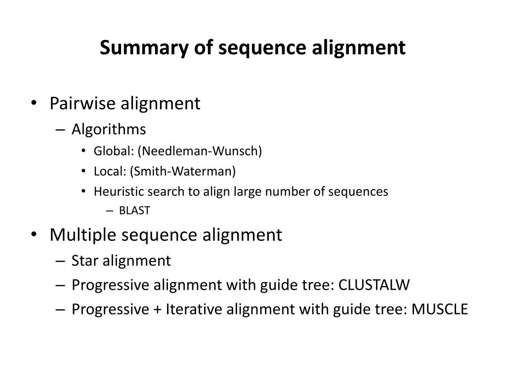 Summary of sequence alignment • Pairwise alignment • Algorithms • Global: (Needleman-Wunsch) • Local: (Smith-Waterman) • Heuristic search to align large number of sequences • BLAST • Multiple sequence alignment • Star alignment • Progressive alignment with guide tree: CLUSTALW • Progressive + Iterative alignment with guide tree: MUSCLE