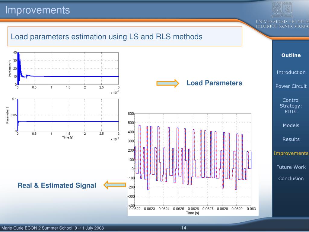 Improvements Load parameters estimation using LS and RLS methods Outline Introduction Power Circuit Control Strategy: PDTC Models Results Improvements Future Work Conclusion Load Parameters Real & Estimated Signal