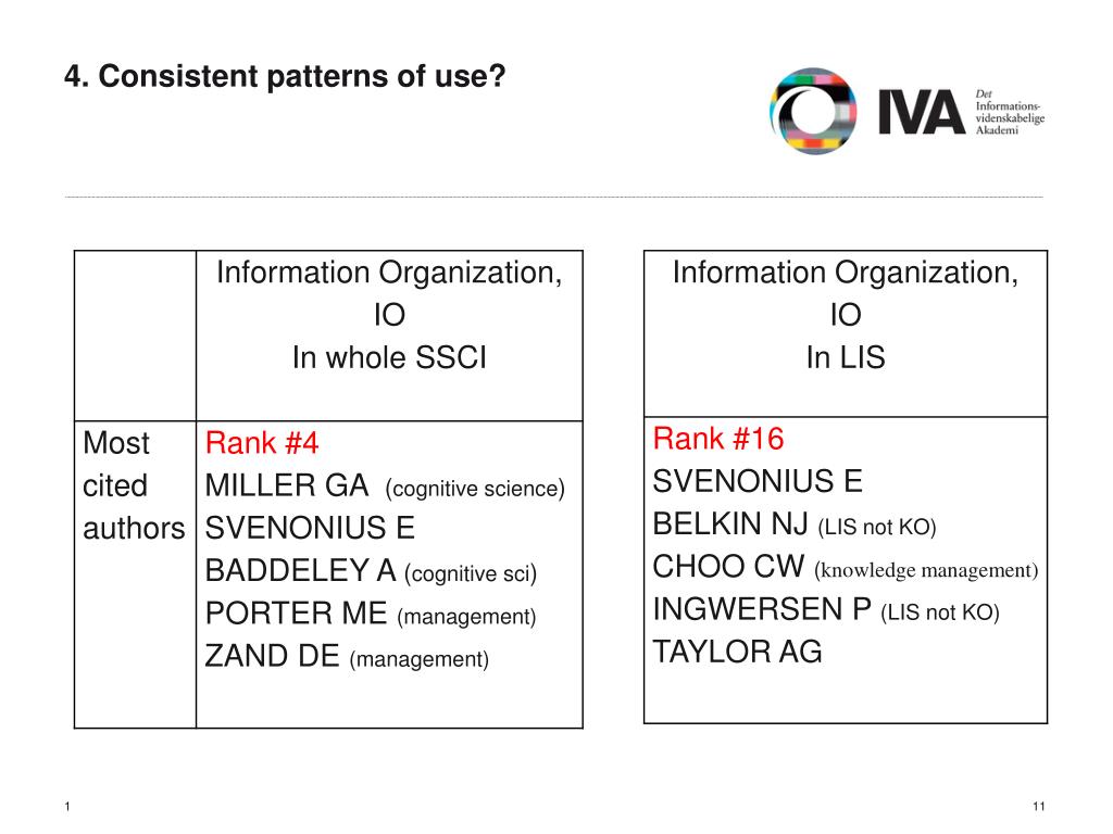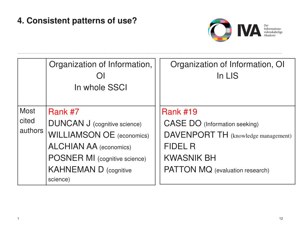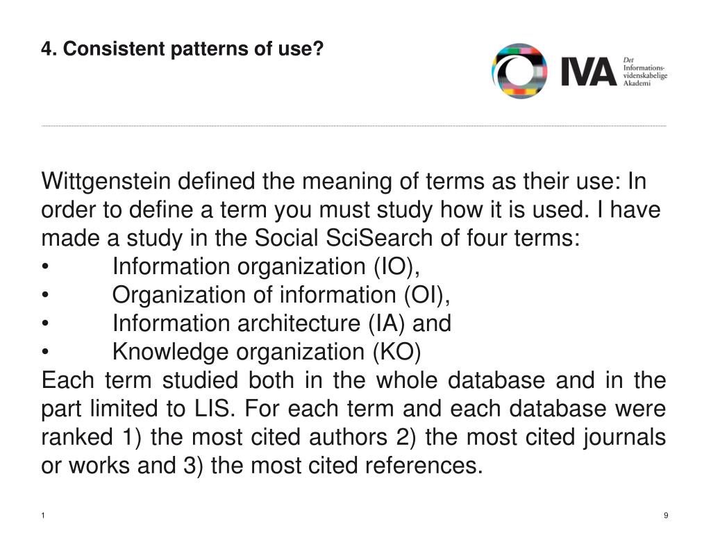 4. Consistent patterns of use? Wittgenstein defined the meaning of terms as their use: In order to define a term you must study how it is used. I have made a study in the Social SciSearch of four terms: • Information organization (IO), • Organization of information (OI), • Information architecture (IA) and • Knowledge organization (KO) Each term studied both in the whole database and in the part limited to LIS. For each term and each database were ranked 1) the most cited authors 2) the most cited journals or works and 3) the most cited references. 1