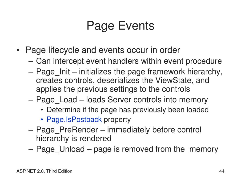 Page Events • Page lifecycle and events occur in order • Can intercept event handlers within event procedure • Page_Init – initializes the page framework hierarchy, creates controls, deserializes the ViewState, and applies the previous settings to the controls • Page_Load – loads Server controls into memory • Determine if the page has previously been loaded • Page.IsPostback property • Page_PreRender – immediately before control hierarchy is rendered • Page_Unload – page is removed from the memory ASP.NET 2.0, Third Edition