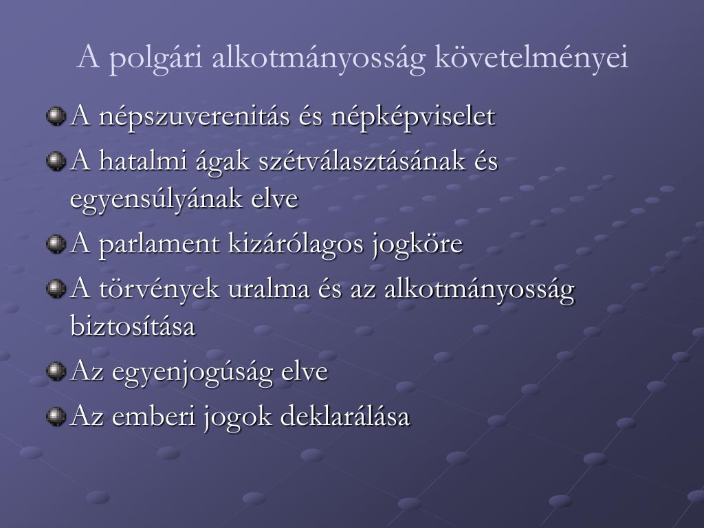 A polgári alkotmányosság követelményei • A népszuverenitás és népképviselet • A hatalmi ágak szétválasztásának és egyensúlyának elve • A parlament kizárólagos jogköre • A törvények uralma és az alkotmányosság biztosítása • Az egyenjogúság elve • Az emberi jogok deklarálása