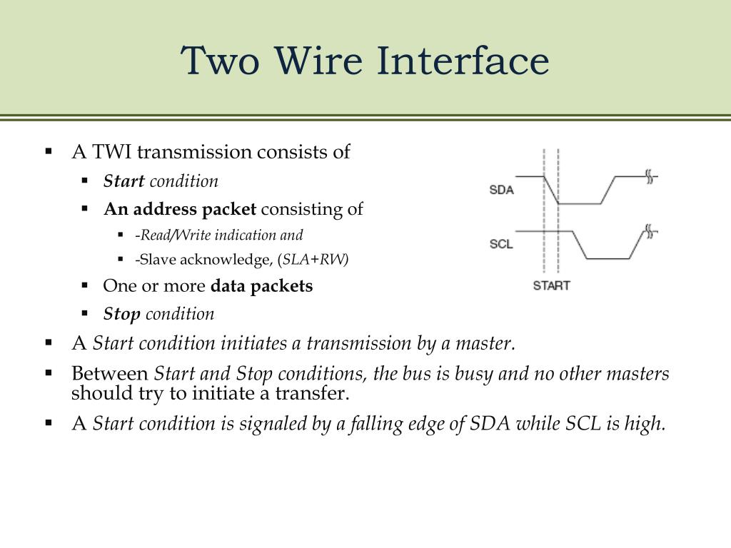 Two Wire Interface (TWI) • A popular serial peripheral interface bus • TWI stands for Two Wire Interface and for most parts this bus is identical to I²C. • The name TWI was introduced by Atmel and other companies to avoid conflicts with trademark issues related to I²C. • -More flexible than SPI (Serial Peripheral Interface ) • -Master and slave modes supported • -7-bit slave address • -Bidirectional, open-drain bus (device pulls down, resistors pull up) • -Two wires, SCL, (clock) and SDA (data) Typical TWI bus configuration