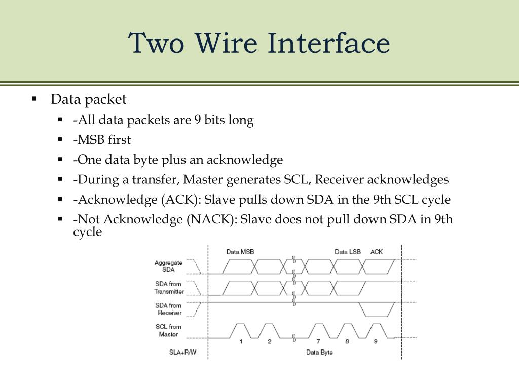 Two Wire Interface • Data packet • -All data packets are 9 bits long • -MSB first • -One data byte plus an acknowledge • -During a transfer, Master generates SCL, Receiver acknowledges • -Acknowledge (ACK): Slave pulls down SDA in the 9th SCL cycle • -Not Acknowledge (NACK): Slave does not pull down SDA in 9th cycle
