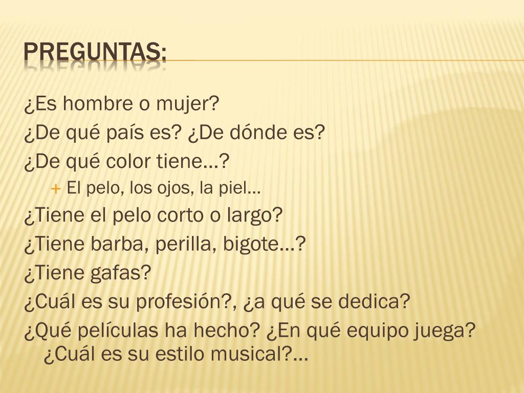 ¿Es hombre o mujer? ¿De qué país es? ¿De dónde es? ¿De qué color tiene…? • El pelo, los ojos, la piel… ¿Tiene el pelo corto o largo? ¿Tiene barba, perilla, bigote…? ¿Tiene gafas? ¿Cuál es su profesión?, ¿a qué se dedica? ¿Qué películas ha hecho? ¿En qué equipo juega? ¿Cuál es su estilo musical?... Preguntas: