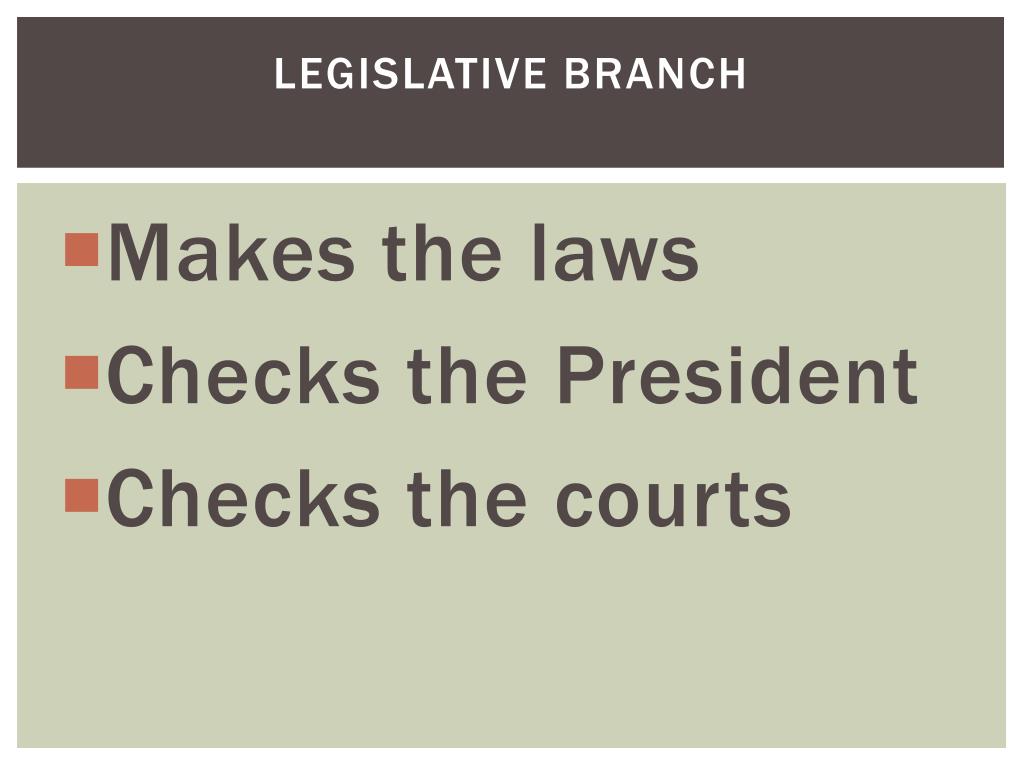Legislative Branch • Makes the laws • Checks the President • Checks the courts