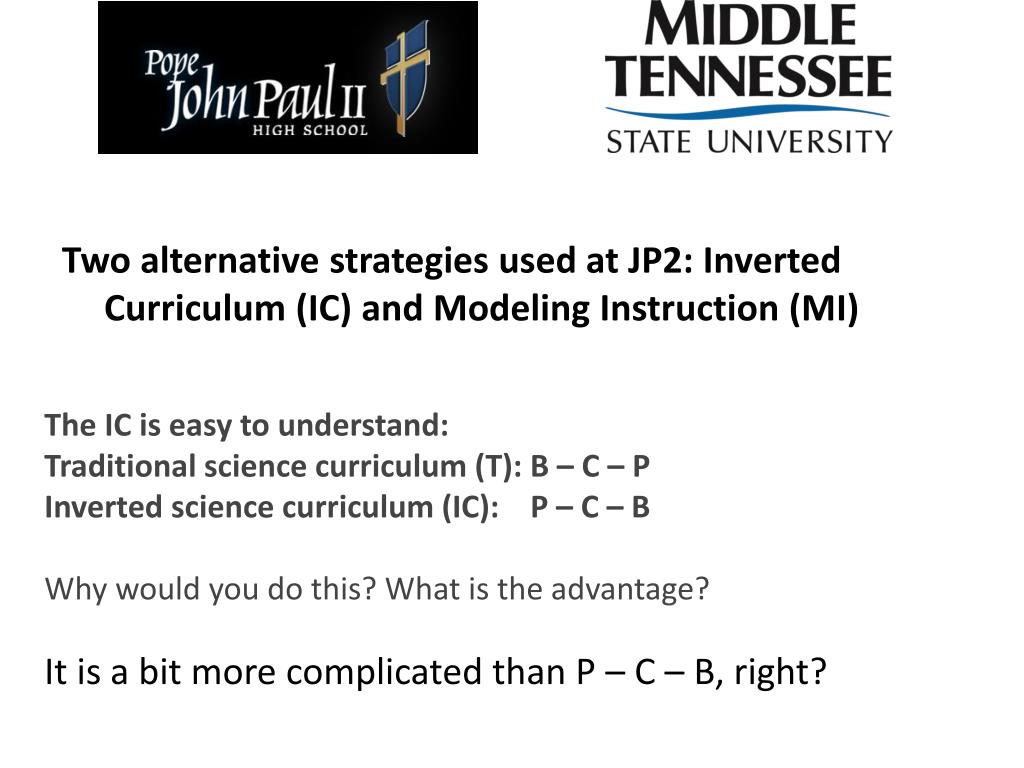 Two alternative strategies used at JP2: Inverted Curriculum (IC) and Modeling Instruction (MI) The IC is easy to understand: Traditional science curriculum (T): B – C – P Inverted science curriculum (IC): P – C – B Why would you do this? What is the advantage? It is a bit more complicated than P – C – B, right?