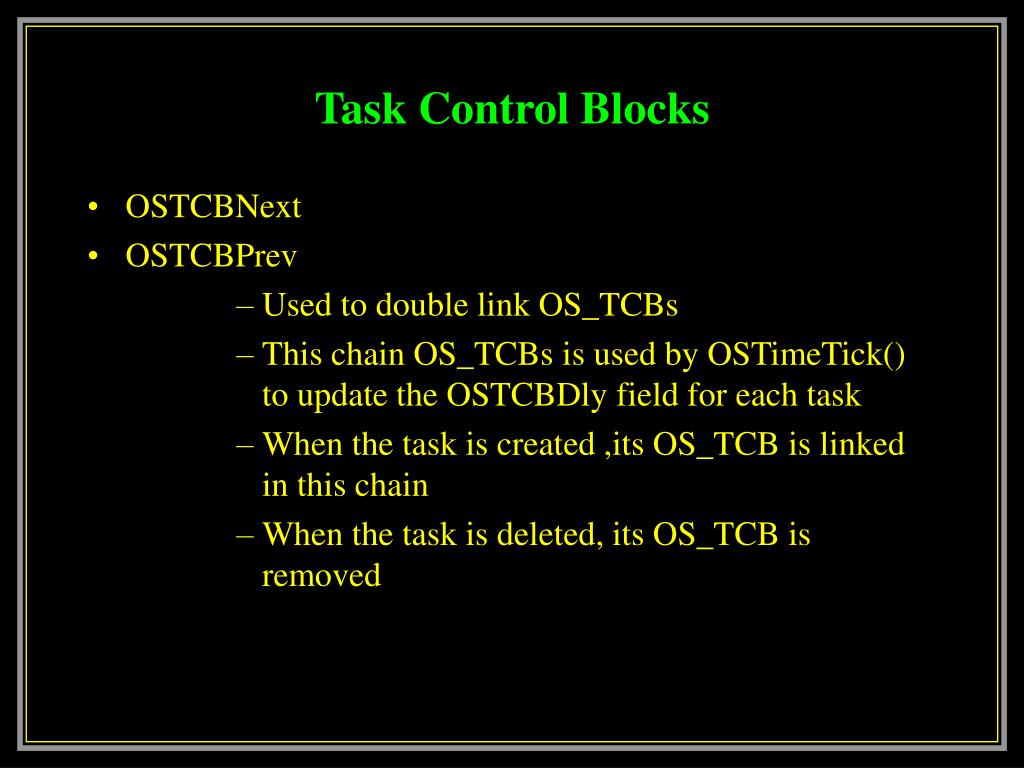 Task Control Blocks • OSTCBNext • OSTCBPrev • Used to double link OS_TCBs • This chain OS_TCBs is used by OSTimeTick() to update the OSTCBDly field for each task • When the task is created ,its OS_TCB is linked in this chain • When the task is deleted, its OS_TCB is removed