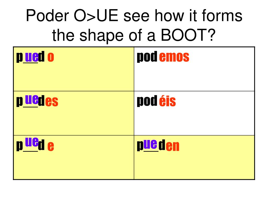 Stem-changing verbs are also called BOOT verbs because they give their stems the boot! They CHANGE THE STEM!