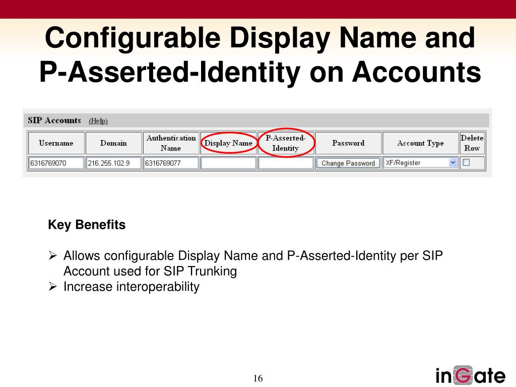 Configurable Display Name and P-Asserted-Identity on Accounts Key Benefits • Allows configurable Display Name and P-Asserted-Identity per SIP Account used for SIP Trunking • Increase interoperability