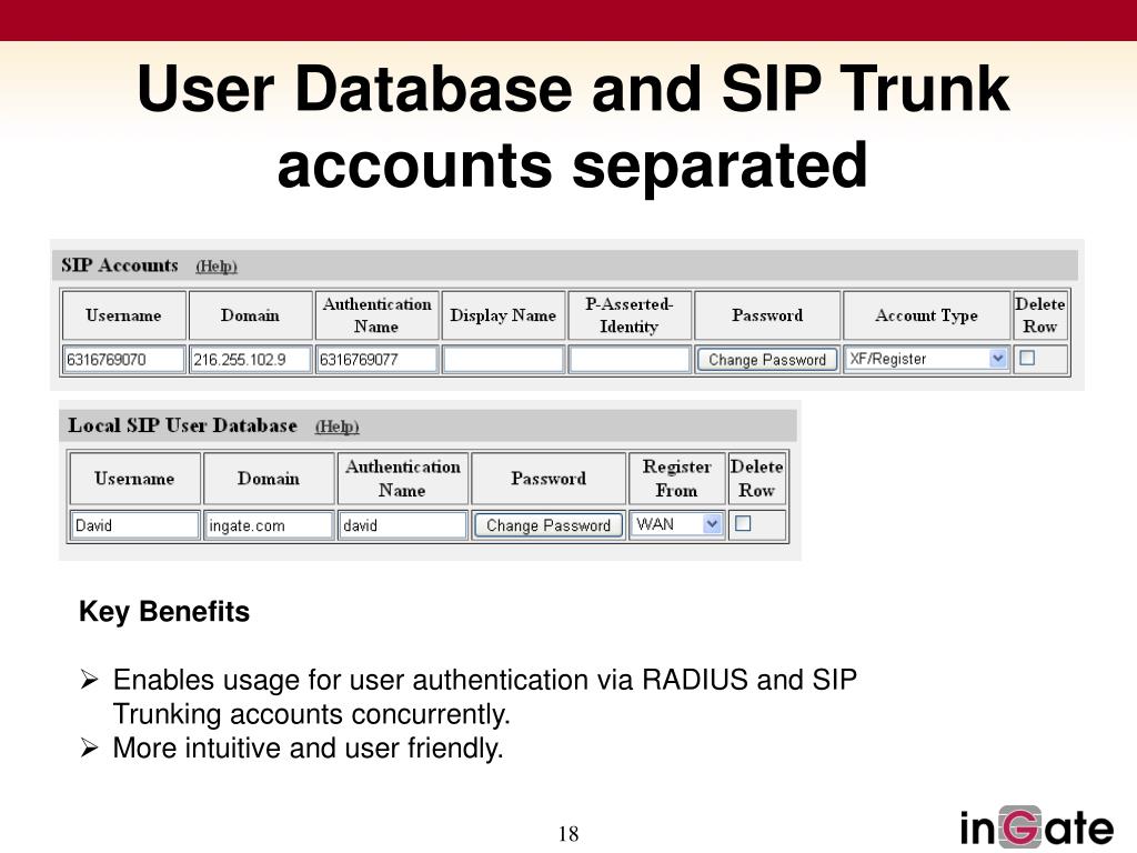 User Database and SIP Trunk accounts separated Key Benefits • Enables usage for user authentication via RADIUS and SIP Trunking accounts concurrently. • More intuitive and user friendly.