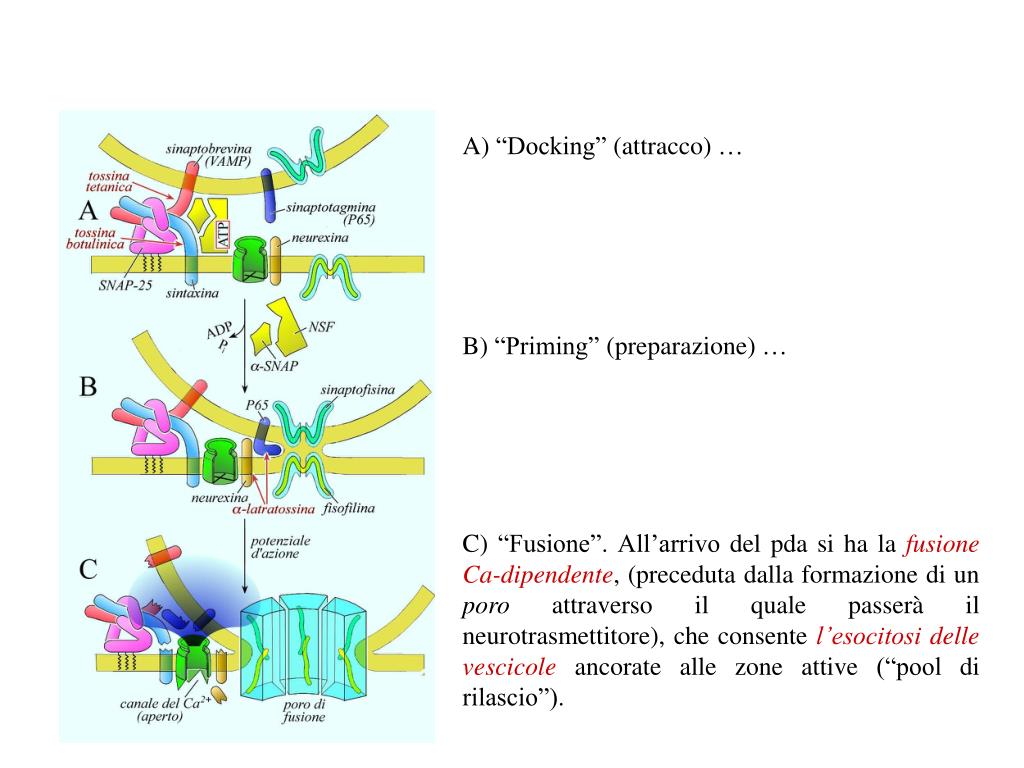 “Docking” (attracco) … B) “Priming” (preparazione) … C) “Fusione”. All’arrivo del pda si ha la fusione Ca-dipendente, (preceduta dalla formazione di un poro attraverso il quale passerà il neurotrasmettitore), che consente l’esocitosi delle vescicole ancorate alle zone attive (“pool di rilascio”).