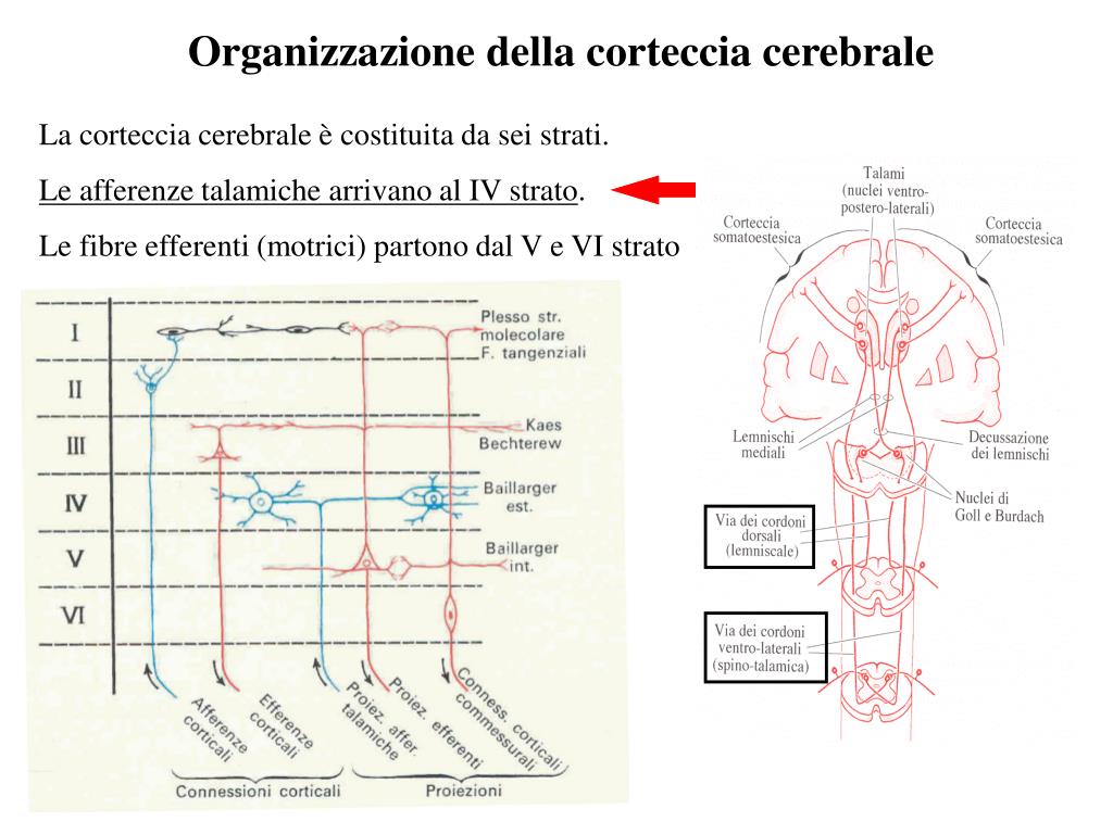 Organizzazione della corteccia cerebrale La corteccia cerebrale è costituita da sei strati. Le afferenze talamiche arrivano al IV strato. Le fibre efferenti (motrici) partono dal V e VI strato