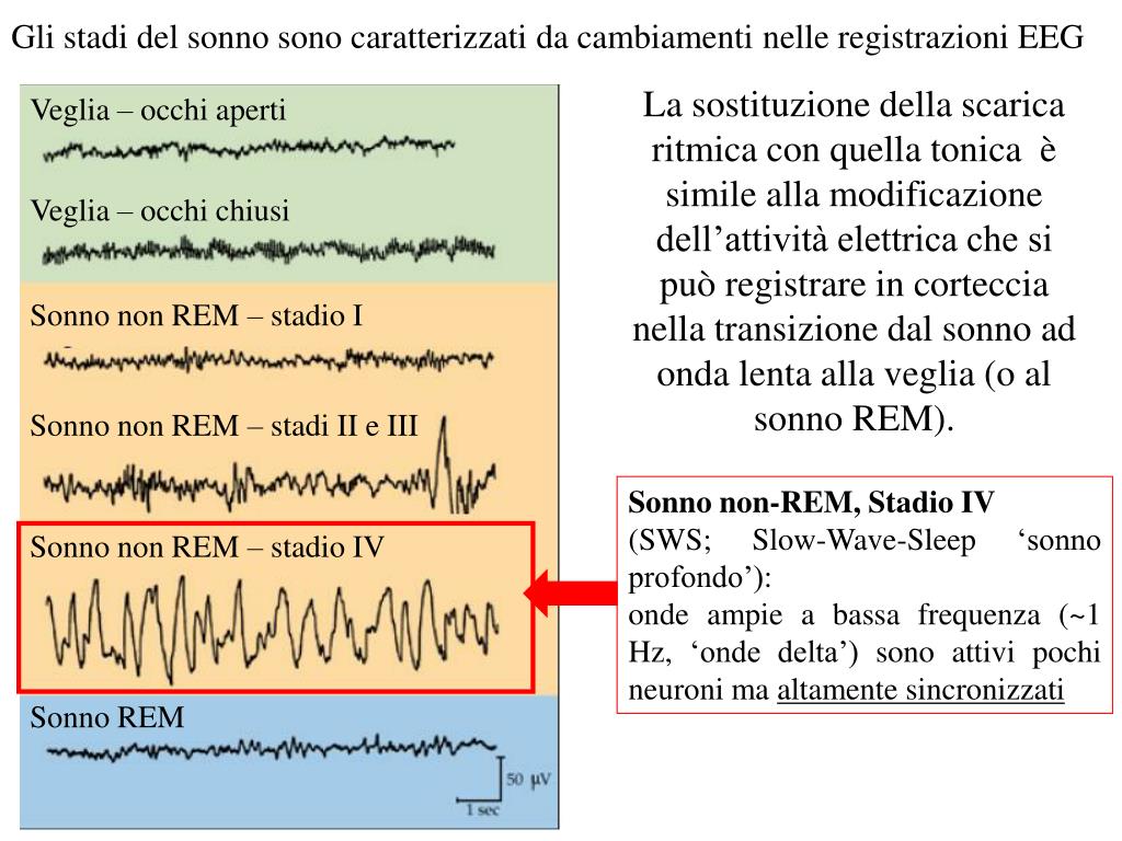 Veglia – occhi aperti Veglia – occhi chiusi Sonno non REM – stadio I Sonno non REM – stadi II e III Sonno non-REM, Stadio IV (SWS; Slow-Wave-Sleep ‘sonno profondo’): onde ampie a bassa frequenza (~1 Hz, ‘onde delta’) sono attivi pochi neuroni ma altamente sincronizzati Sonno non REM – stadio IV Sonno REM Gli stadi del sonno sono caratterizzati da cambiamenti nelle registrazioni EEG La sostituzione della scarica ritmica con quella tonica è simile alla modificazione dell’attività elettrica che si può registrare in corteccia nella transizione dal sonno ad onda lenta alla veglia (o al sonno REM).