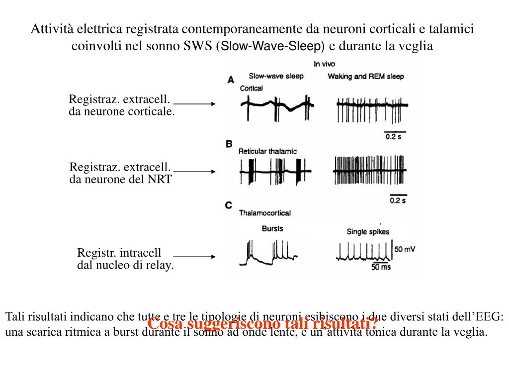 Attività elettrica registrata contemporaneamente da neuroni corticali e talamici coinvolti nel sonno SWS (Slow-Wave-Sleep) e durante la veglia Registraz. extracell. da neurone corticale. Registraz. extracell. da neurone del NRT Registr. intracell dal nucleo di relay. Tali risultati indicano che tutte e tre le tipologie di neuroni esibiscono i due diversi stati dell’EEG: una scarica ritmica a burst durante il sonno ad onde lente, e un’attività tonica durante la veglia. Cosa suggeriscono tali risultati?