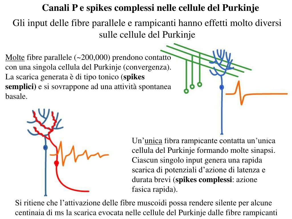 Canali P e spikes complessi nelle cellule del Purkinje Molte fibre parallele (~200,000) prendono contatto con una singola cellula del Purkinje (convergenza). La scarica generata è di tipo tonico (spikes semplici) e si sovrappone ad una attività spontanea basale. Un’unica fibra rampicante contatta un’unica cellula del Purkinje formando molte sinapsi. Ciascun singolo input genera una rapida scarica di potenziali d’azione di latenza e durata brevi (spikes complessi: azione fasica rapida). Gli input delle fibre parallele e rampicanti hanno effetti molto diversi sulle cellule del Purkinje Si ritiene che l’attivazione delle fibre muscoidi possa rendere silente per alcune centinaia di ms la scarica evocata nelle cellule del Purkinje dalle fibre rampicanti