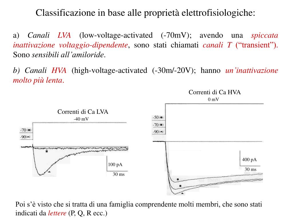 Correnti di Ca HVA 0 mV Correnti di Ca LVA -40 mV 400 pA 100 pA 30 ms 30 ms Classificazione in base alle proprietà elettrofisiologiche: a) Canali LVA (low-voltage-activated (-70mV); avendo una spiccata inattivazione voltaggio-dipendente, sono stati chiamati canali T (“transient”). Sono sensibili all’amiloride. b) Canali HVA (high-voltage-activated (-30m/-20V); hanno un’inattivazione molto più lenta. Poi s’è visto che si tratta di una famiglia comprendente molti membri, che sono stati indicati da lettere (P, Q, R ecc.)
