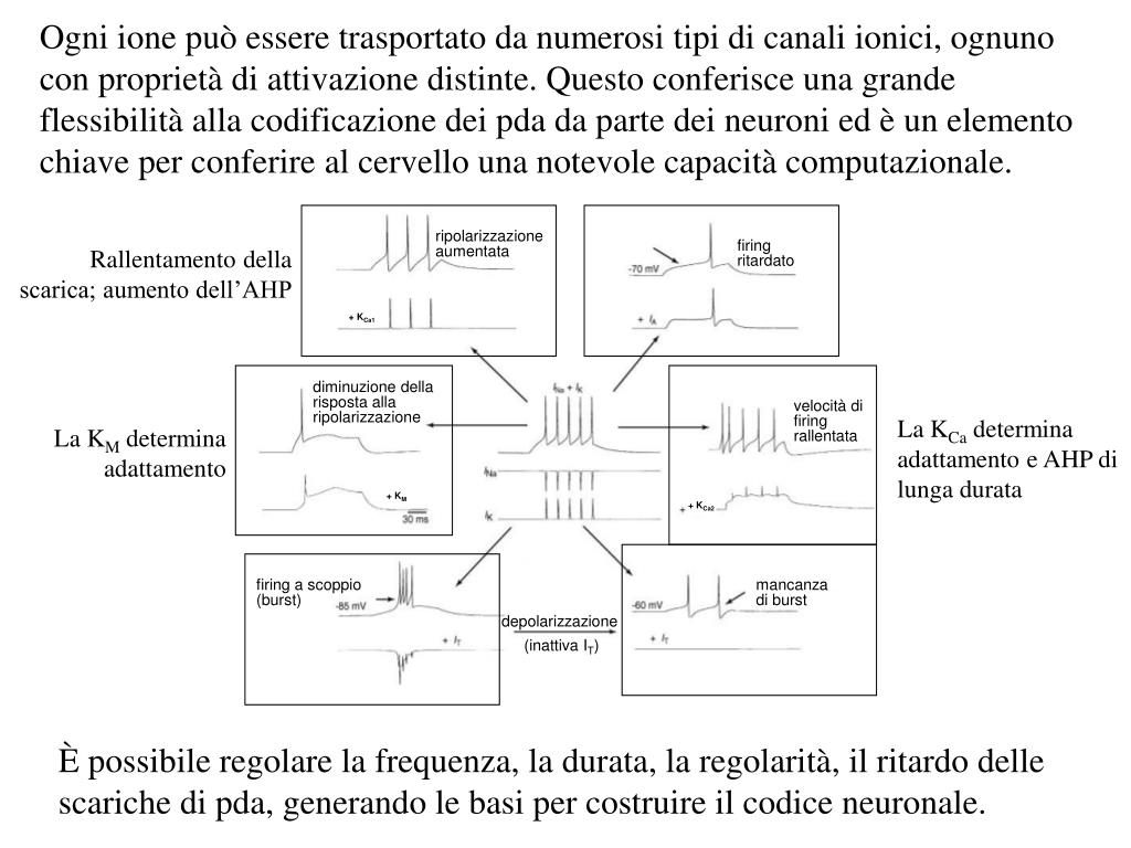 ripolarizzazione aumentata firing ritardato + KCa1 diminuzione della risposta alla ripolarizzazione velocità di firing rallentata + KM + KCa2 firing a scoppio (burst) mancanza di burst depolarizzazione (inattiva IT) Ogni ione può essere trasportato da numerosi tipi di canali ionici, ognuno con proprietà di attivazione distinte. Questo conferisce una grande flessibilità alla codificazione dei pda da parte dei neuroni ed è un elemento chiave per conferire al cervello una notevole capacità computazionale. Rallentamento della scarica; aumento dell’AHP La KCa determina adattamento e AHP di lunga durata La KM determina adattamento È possibile regolare la frequenza, la durata, la regolarità, il ritardo delle scariche di pda, generando le basi per costruire il codice neuronale.