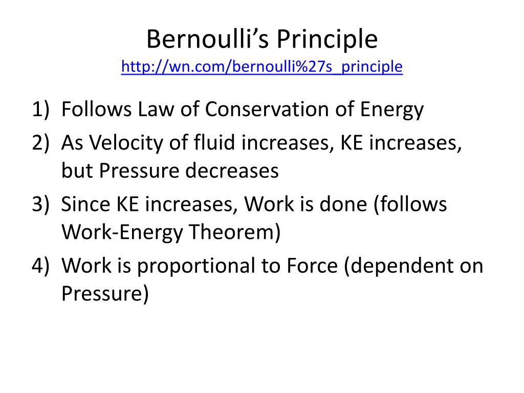 Bernoulli’s Principlehttp://wn.com/bernoulli%27s_principle • Follows Law of Conservation of Energy • As Velocity of fluid increases, KE increases, but Pressure decreases • Since KE increases, Work is done (follows Work-Energy Theorem) • Work is proportional to Force (dependent on Pressure)