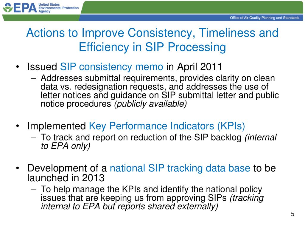 Actions to Improve Consistency, Timeliness and Efficiency in SIP Processing • Issued SIP consistency memo in April 2011 • Addresses submittal requirements, provides clarity on clean data vs. redesignation requests, and addresses the use of letter notices and guidance on SIP submittal letter and public notice procedures (publicly available) • Implemented Key Performance Indicators (KPIs) • To track and report on reduction of the SIP backlog (internal to EPA only) • Development of a national SIP tracking data base to be launched in 2013 • To help manage the KPIs and identify the national policy issues that are keeping us from approving SIPs (tracking internal to EPA but reports shared externally)