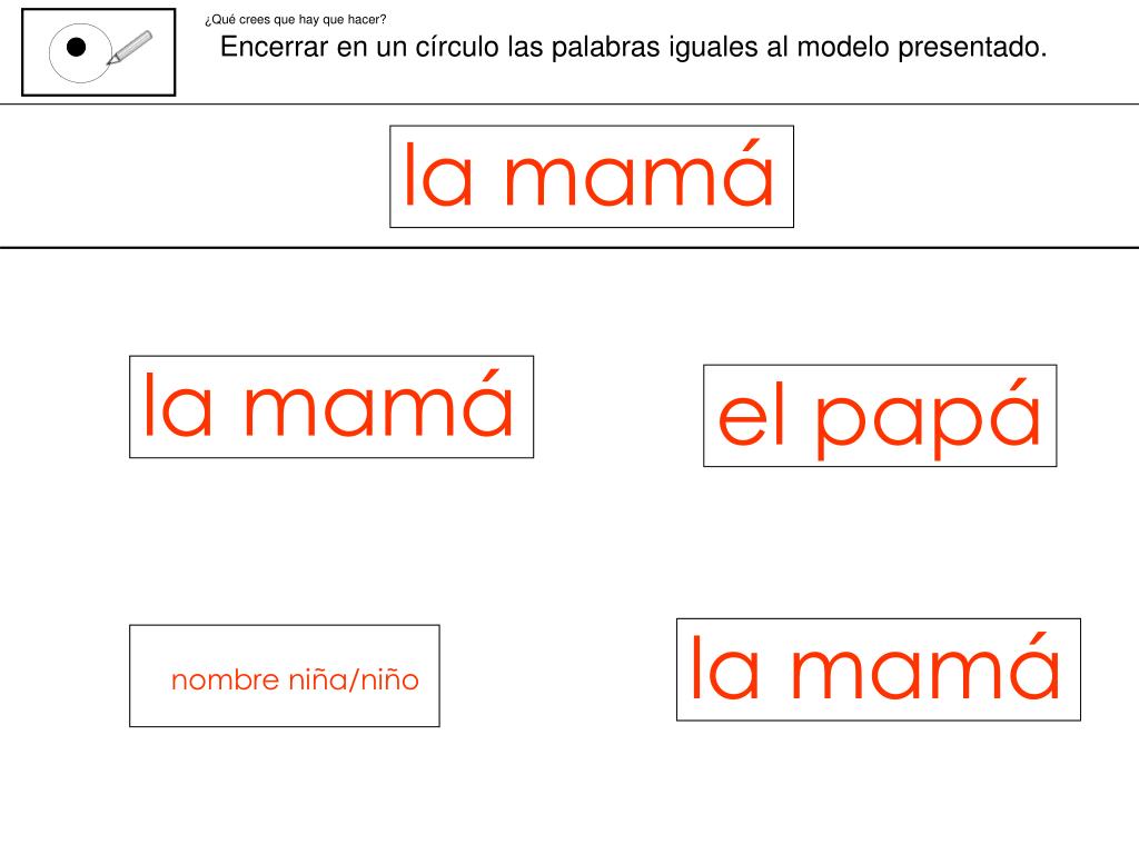 el papá ¿Qué crees que hay que hacer? Encerrar en un círculo las palabras iguales al modelo presentado. la mamá la mamá nombre niña/niño la mamá