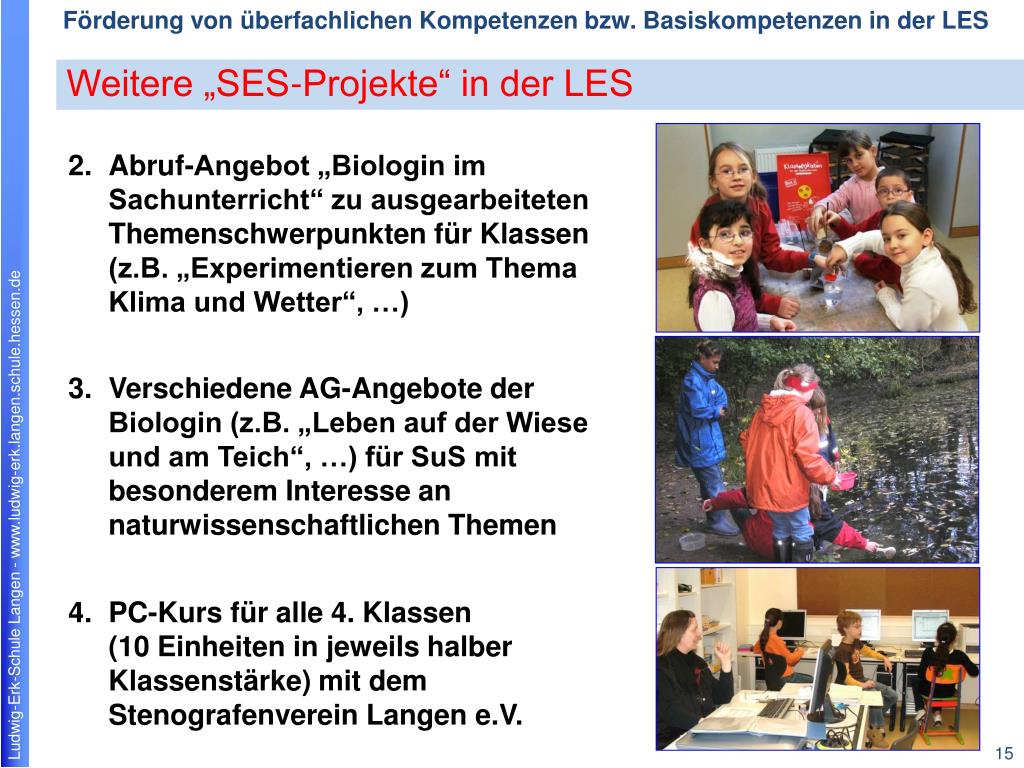 Weitere „SES-Projekte“ in der LES 2. Abruf-Angebot „Biologin im Sachunterricht“ zu ausgearbeiteten Themenschwerpunkten für Klassen (z.B. „Experimentieren zum Thema Klima und Wetter“, …) 3. Verschiedene AG-Angebote der Biologin (z.B. „Leben auf der Wiese und am Teich“, …) für SuS mit besonderem Interesse an naturwissenschaftlichen Themen 4. PC-Kurs für alle 4. Klassen (10 Einheiten in jeweils halber Klassenstärke) mit dem Stenografenverein Langen e.V.