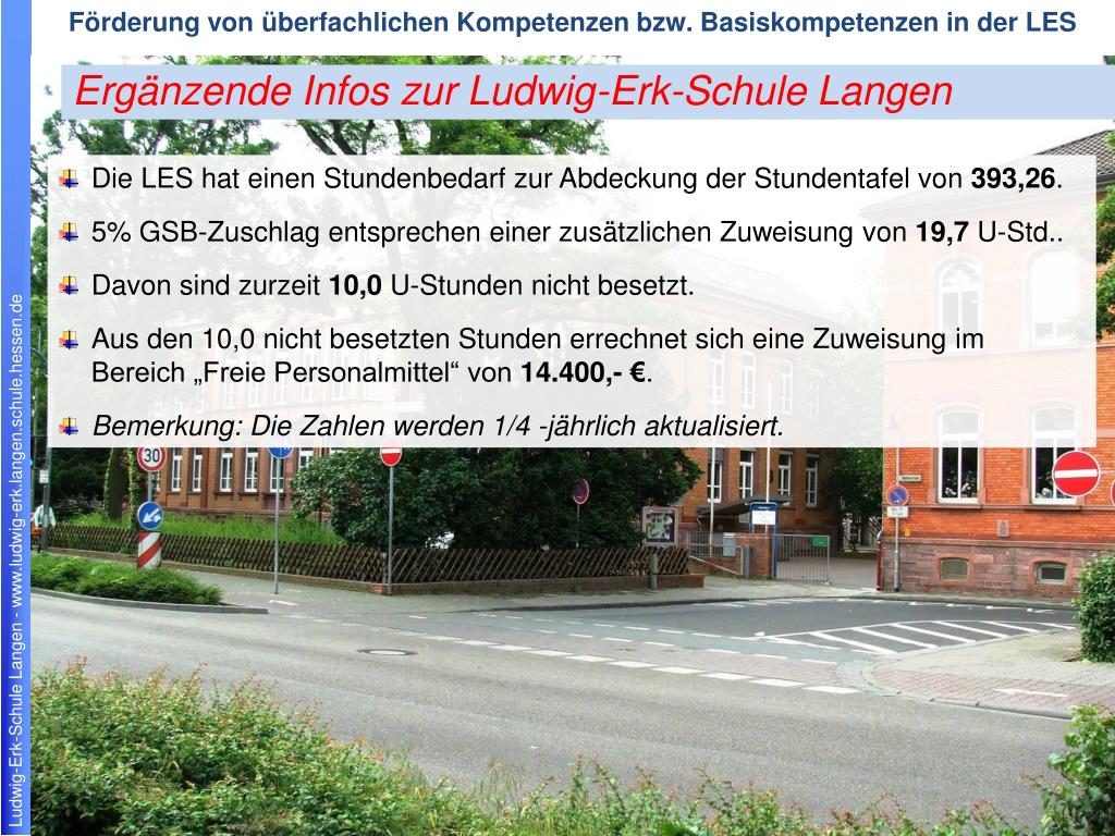 Ergänzende Infos zur Ludwig-Erk-Schule Langen • Die LES hat einen Stundenbedarf zur Abdeckung der Stundentafel von 393,26. • 5% GSB-Zuschlag entsprechen einer zusätzlichen Zuweisung von 19,7 U-Std.. • Davon sind zurzeit 10,0 U-Stunden nicht besetzt. • Aus den 10,0 nicht besetzten Stunden errechnet sich eine Zuweisung im Bereich „Freie Personalmittel“ von 14.400,- €. • Bemerkung: Die Zahlen werden 1/4 -jährlich aktualisiert.