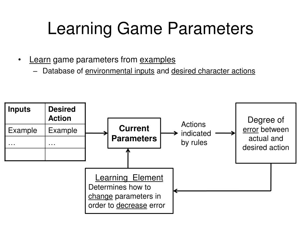 Learning Game Parameters • Learn game parameters from examples • Database of environmental inputs and desired character actions Degree of error between actual and desired action Current Parameters Actions indicated by rules Learning Element Determines how to change parameters in order to decrease error