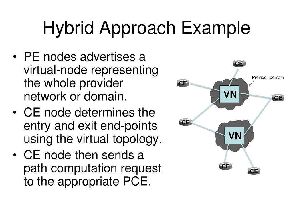 Hybrid Approach Example • PE nodes advertises a virtual-node representing the whole provider networkor domain. • CE node determines the entry and exit end-points using the virtual topology. • CE node then sends a path computation request to the appropriate PCE. Provider Domain Provider Domain-1 VN Provider Domain-1 VN CE CE CE CE CE CE
