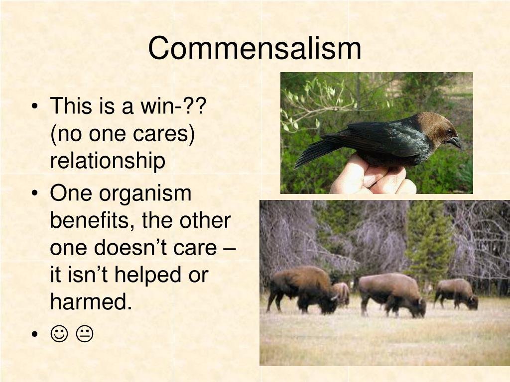 Commensalism • This is a win-?? (no one cares) relationship • One organism benefits, the other one doesn’t care – it isn’t helped or harmed. •