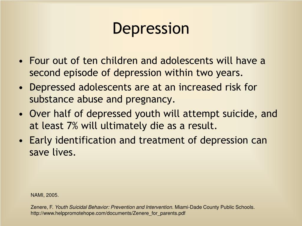Depression • Four out of ten children and adolescents will have a second episode of depression within two years. • Depressed adolescents are at an increased risk for substance abuse and pregnancy. • Over half of depressed youth will attempt suicide, and at least 7% will ultimately die as a result. • Early identification and treatment of depression can save lives. NAMI, 2005. Zenere, F. Youth Suicidal Behavior: Prevention and Intervention. Miami-Dade County Public Schools. http://www.helppromotehope.com/documents/Zenere_for_parents.pdf