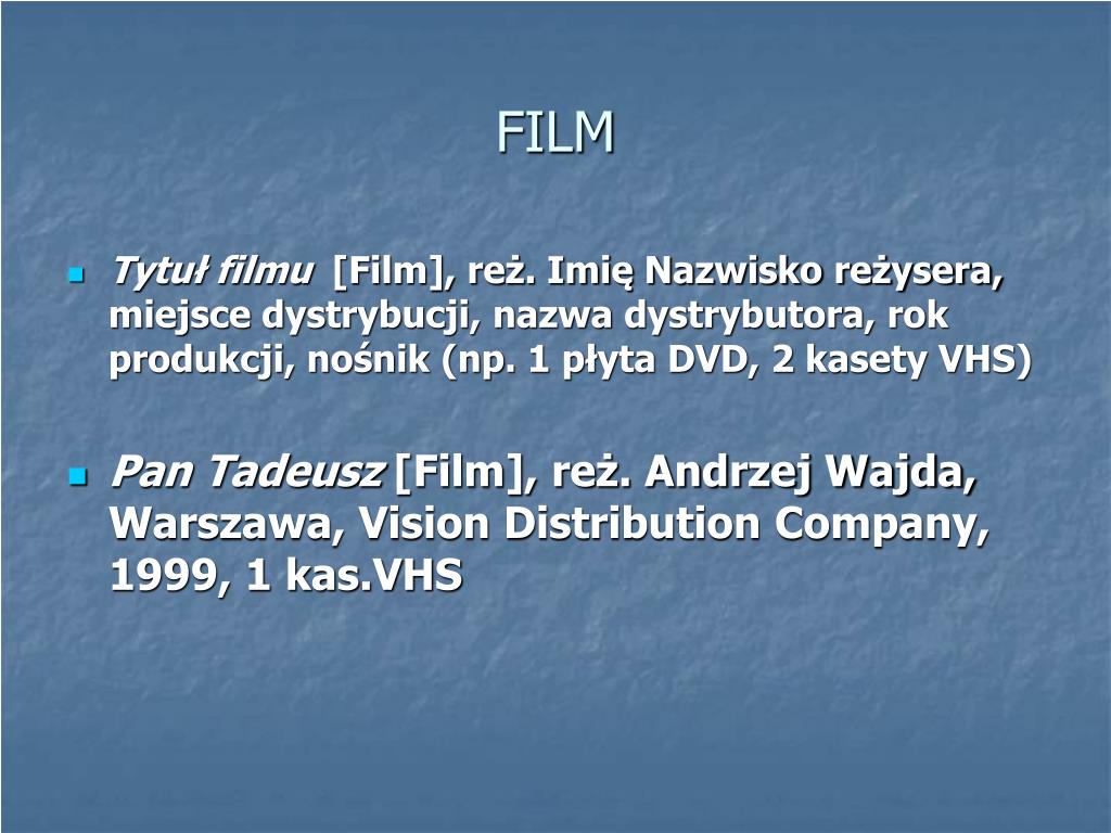 FILM • Tytuł filmu [Film], reż. Imię Nazwisko reżysera,miejsce dystrybucji, nazwa dystrybutora, rok produkcji, nośnik (np. 1 płyta DVD, 2 kasety VHS) • Pan Tadeusz [Film], reż. Andrzej Wajda, Warszawa, Vision Distribution Company, 1999, 1 kas.VHS